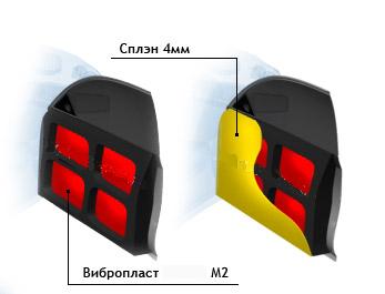 - Декоративную накладку двери частично (20%) обклеиваем кусочками материала Вибропласт М2. Вторым слоем по всей плоскости накладки наклеиваем шумо-теплоизоляционный материал Сплэн 4мм на клеевой основе.