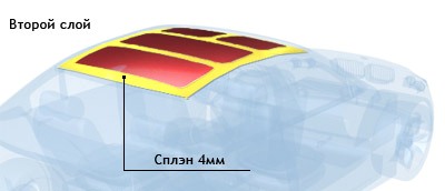 - Вторым слоем (поверх материала Вибропласт М2) наклеиваем материал Сплэн 4мм на клеевой основе. Проклеивается вся поверхность крыши, кроме ребер жесткости.